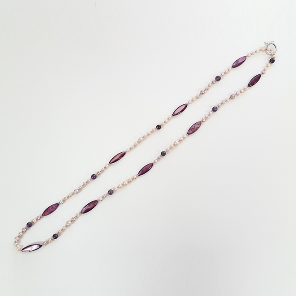 カラー:グリーン、 パープル 長さ:100cm 素材:淡水パール (約5-7.5m) グリーン(シェル、メノウ) パープル(アメシスト、シェル) クリッカー付き